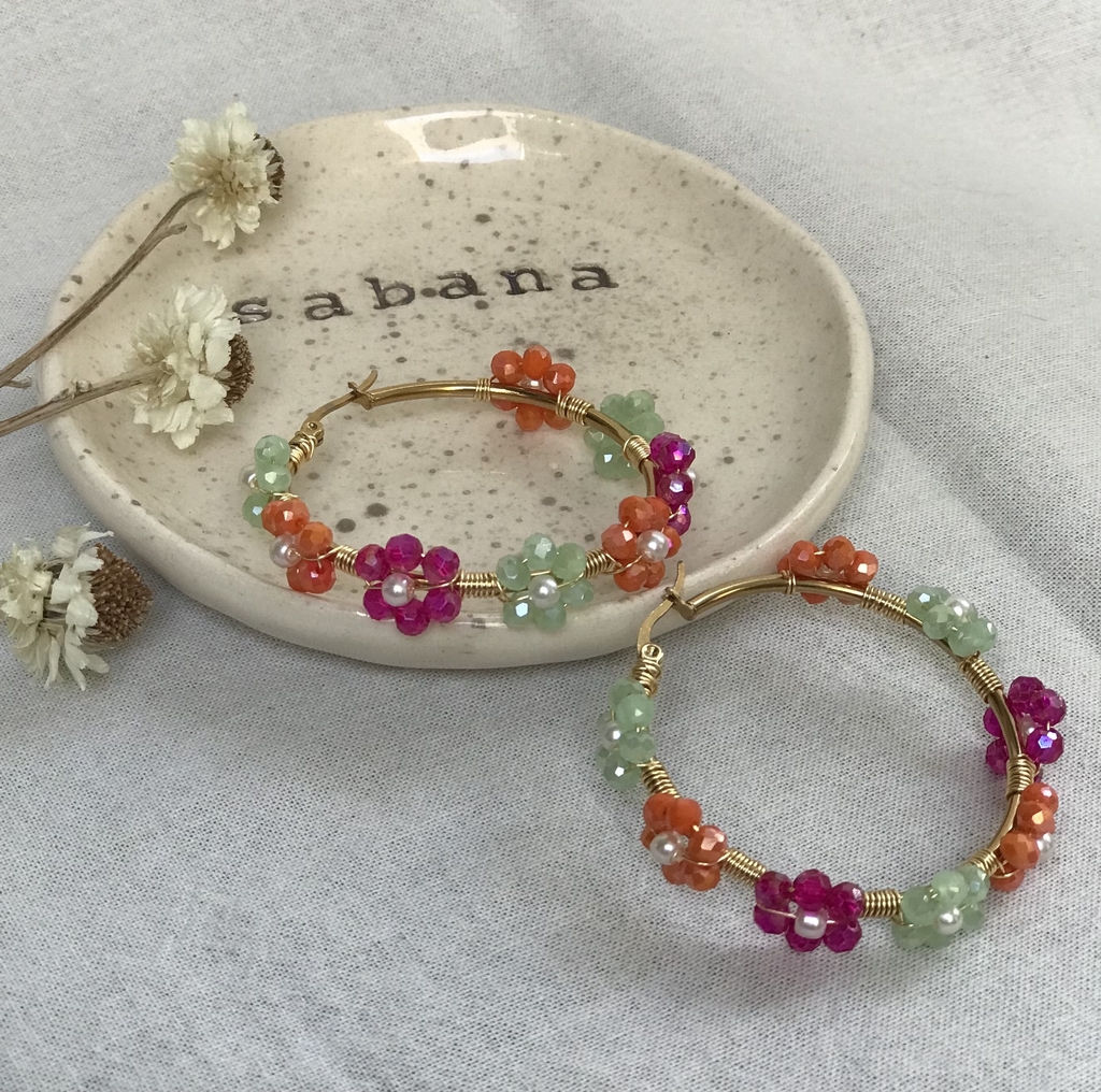 Los aros Margarita de Sabana Joyas son de Gold Filled baño de oro 18k y de acero inoxidable, cada flor es hecha a mano con cristales checos, los puedes personalizar con la combinación de colores que te guste. Importante: Escribe al mail la combinación de tres colores que deseas.
