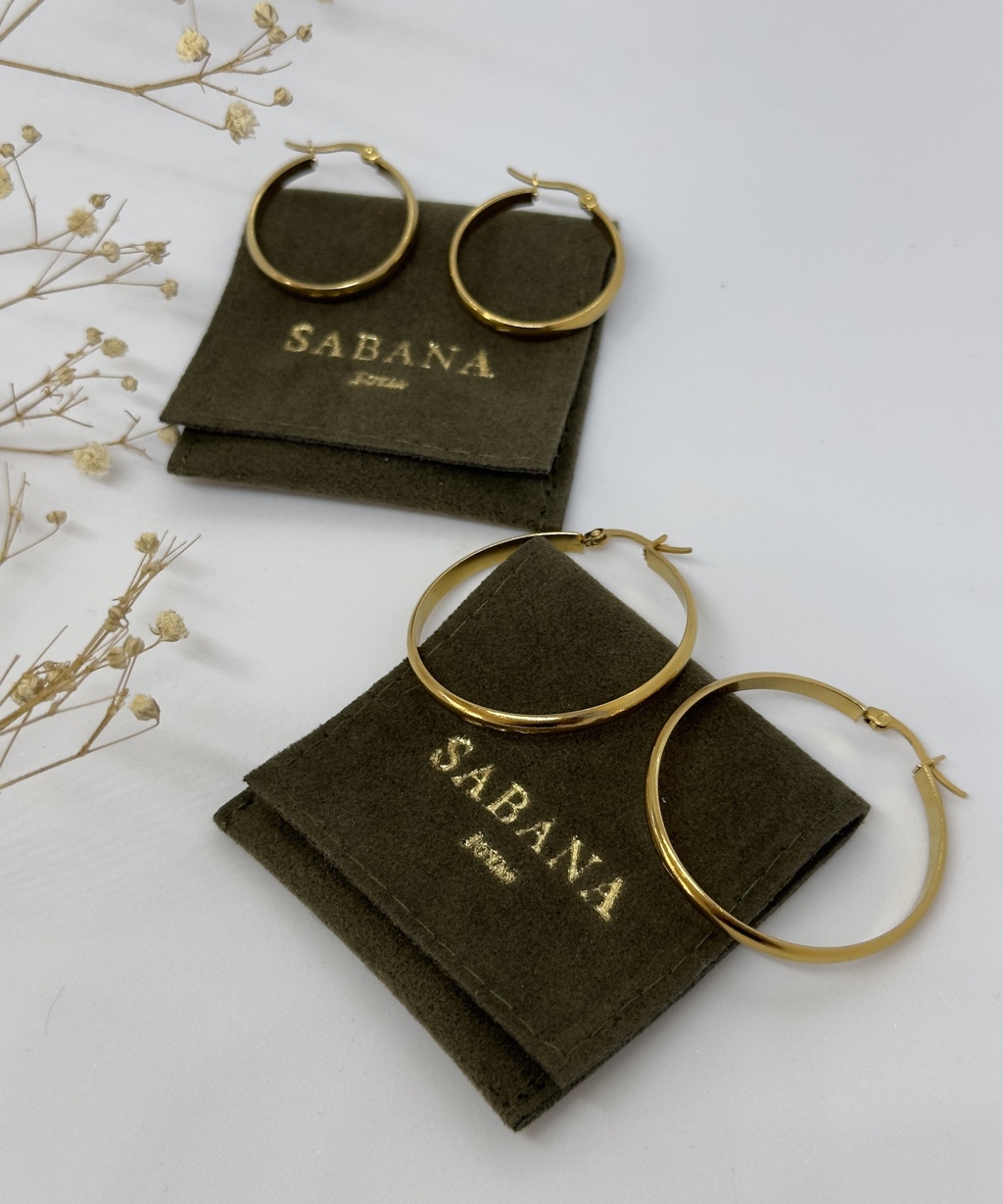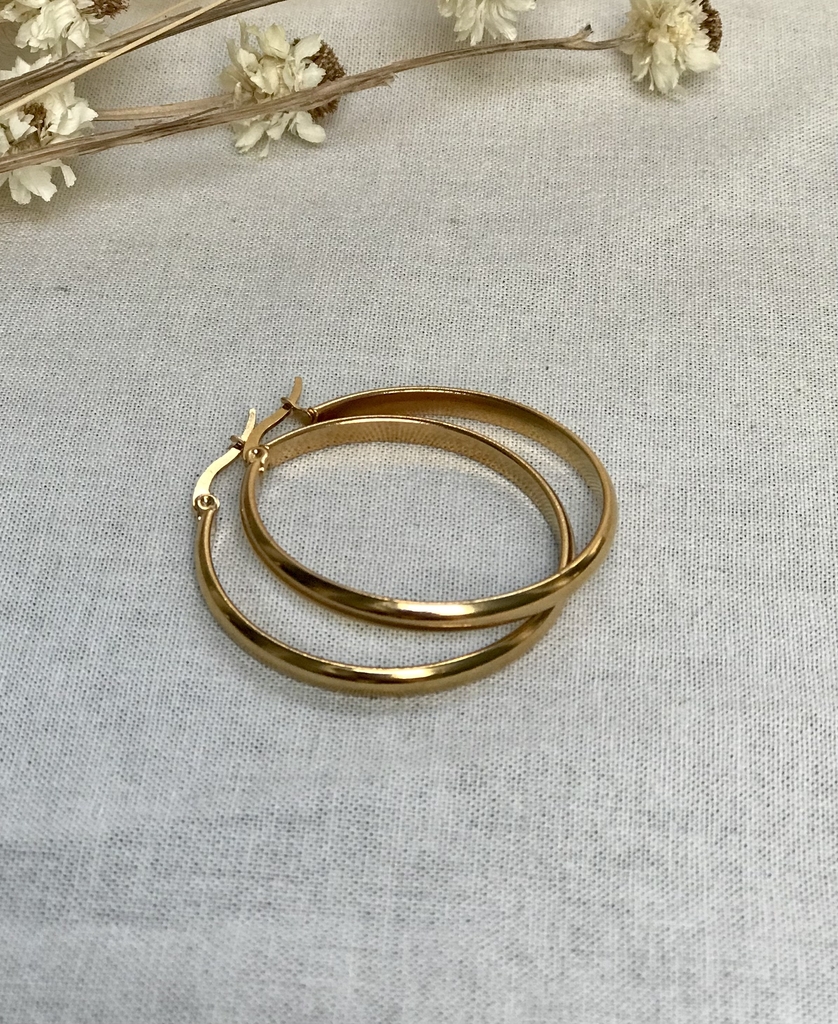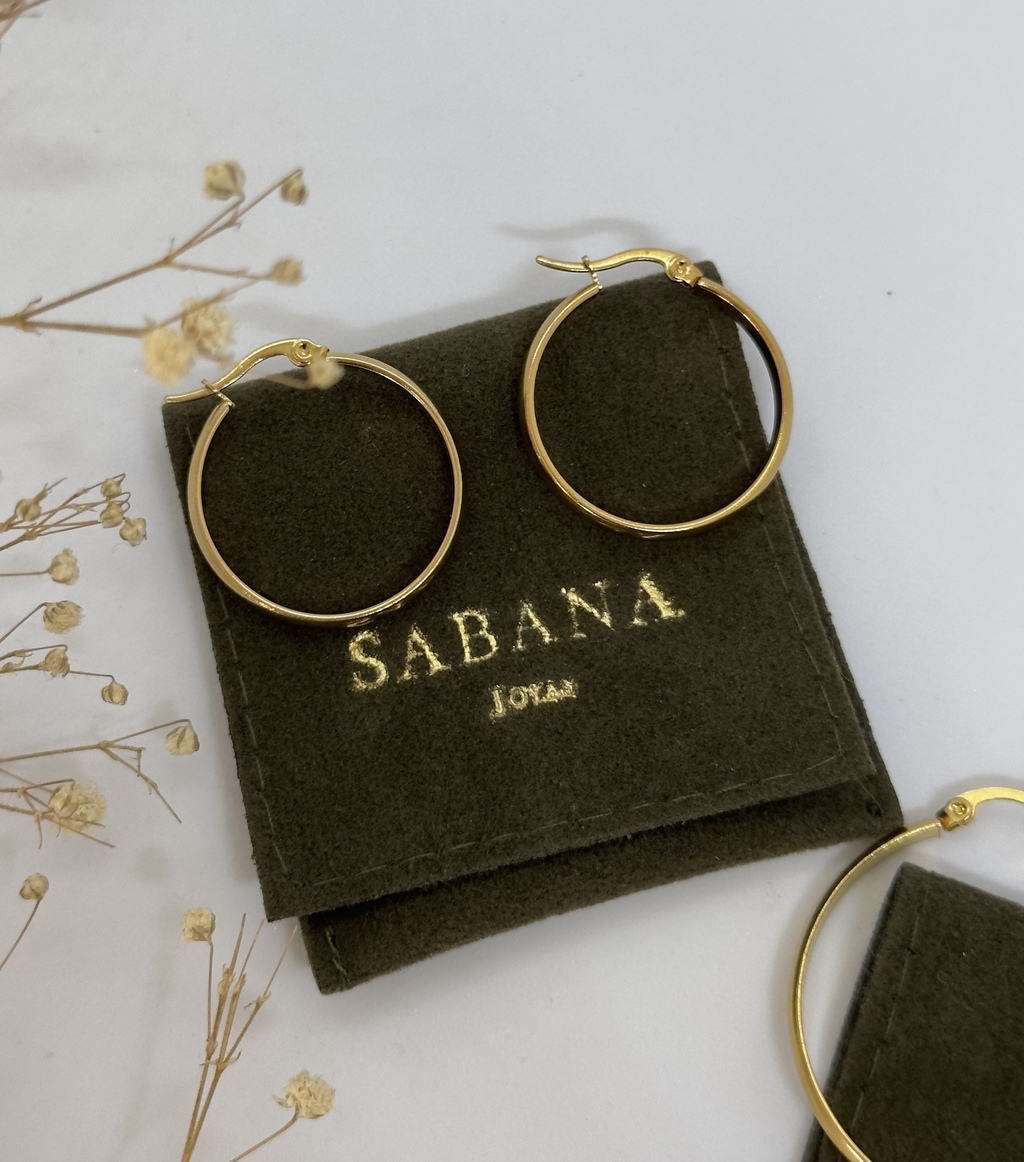 Los aros New York de Sabana Joyas son de Acero inoxidable con baño de oro. Vienen en dos tamaños medianos de 2,5cm y los grandes 4cm, son comodos y livianos para usar diariamente.