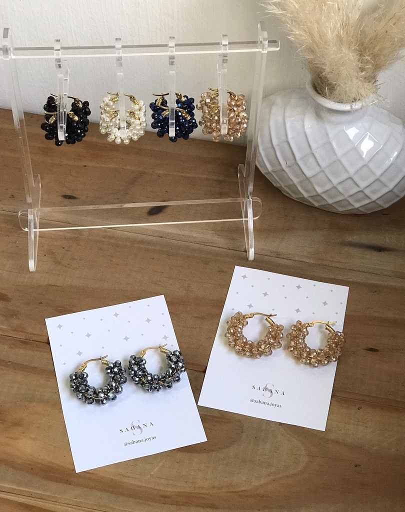 Los aros Renacer de Sabana Joyas son de Gold Filled baño de oro 18k y de acero inoxidable, son tejidas con cristales checos en diferentes colores para elegir. Miden 3 cm y son livianas, tambien estan disponibles en tamaño pequeño.