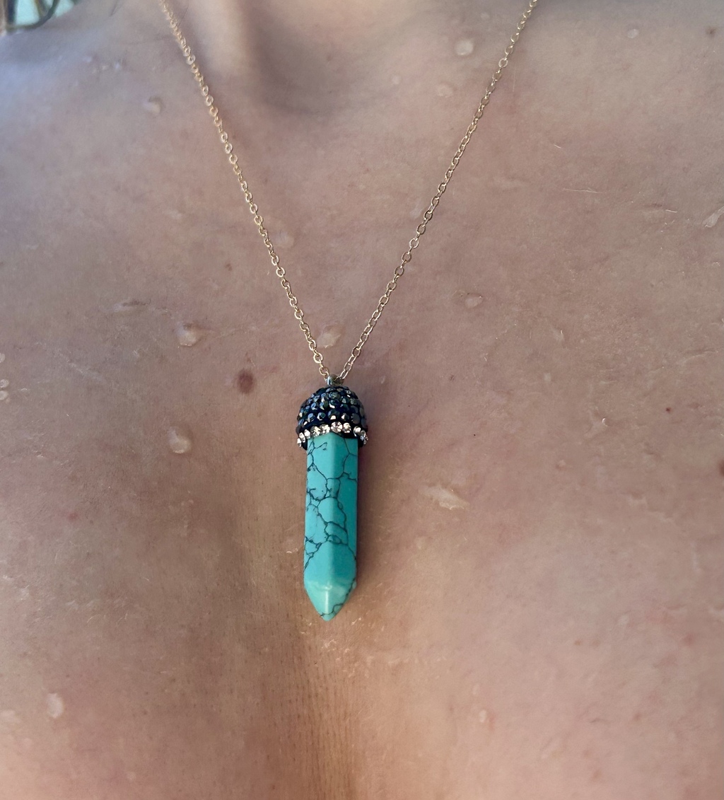 La cadena Celestial de Sabana Joyas es de Gold Filled baño de oro 18k, con un dije de piedra color turquesa y brillantes en la parte superior. Esta cadena mide 52cm, la cual te quedará larga para poder combinarla con otros collares.