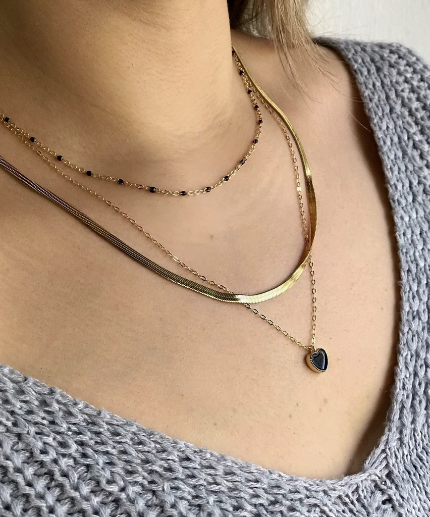 La cadena Intuición de Sabana Joyas es de Gold Filled baño de oro 18k, con un dije en forma de corazón en color negro por delante y por detrás, mide 42cm una medida comoda para cualquier tipo de cuello.