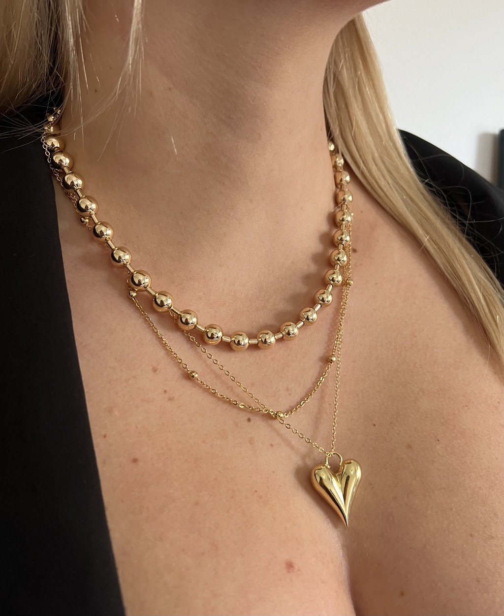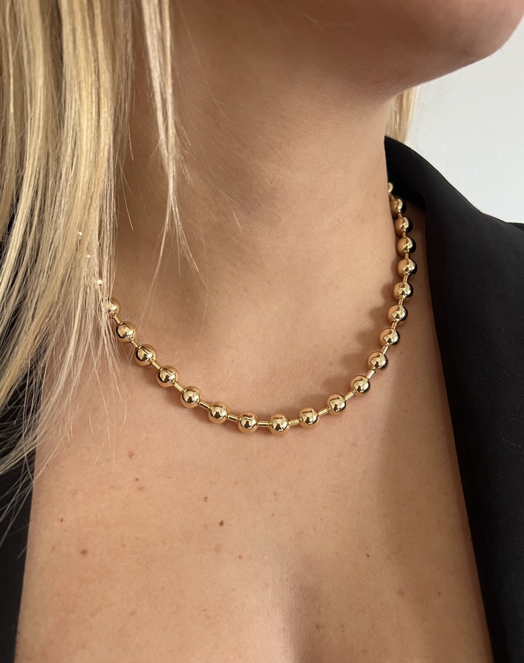 La cadena Roma de Sabana Joyas es de Gold Filled baño de oro 18k importado, con balines gruesos por toda la cadena. Mide 44cm más la cadena de extensión de 4cm, una medida comoda para usarla sola o combinarla con otras cadenas.