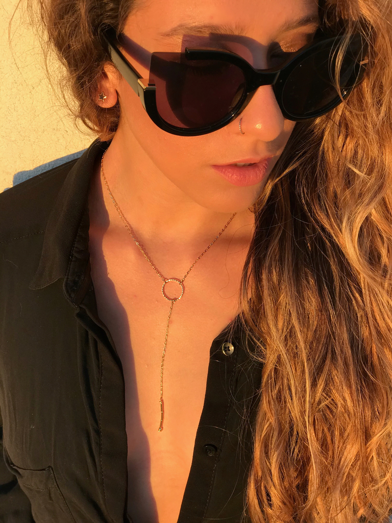 El collar Alma de Sabana Joyas es de Gold Filled baño de oro 18k, es largo con caida en el pecho, tiene un dije de silueta circular y al final un tunel con un balin.
