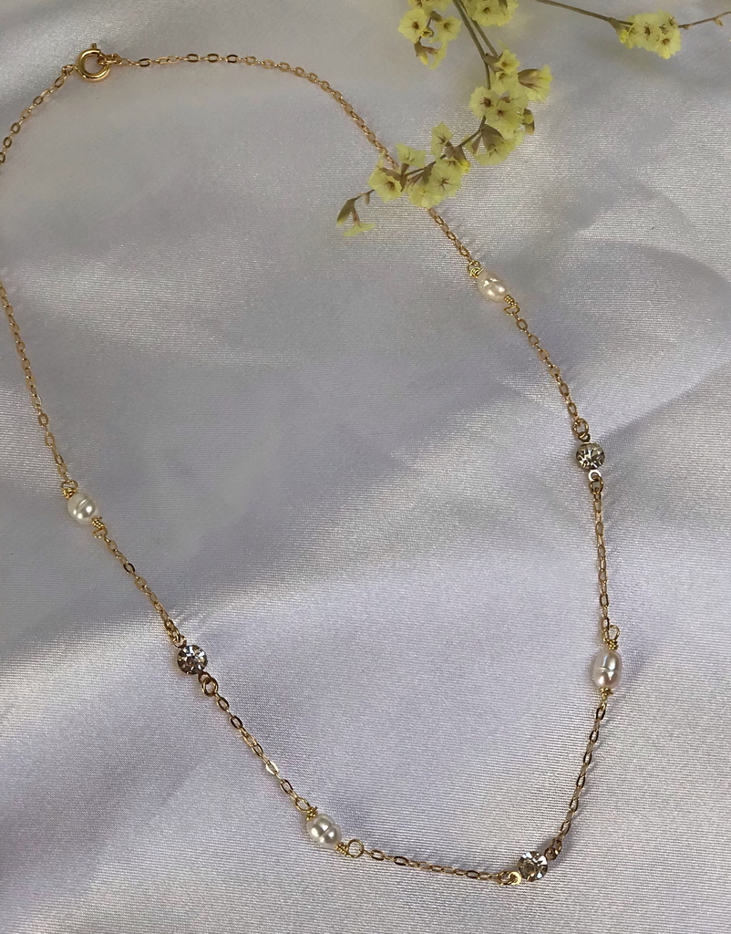 El collar Diana de Sabana Joyas es de Gold Filled baño de oro 18k, con perlas cultivadas y cristales de zircón. La cadena mide 42cm una medida comoda para cualquier tipo de cuello. Es elegante y muchas de nuestras clientas la han elegido para usarla el día de su boda.