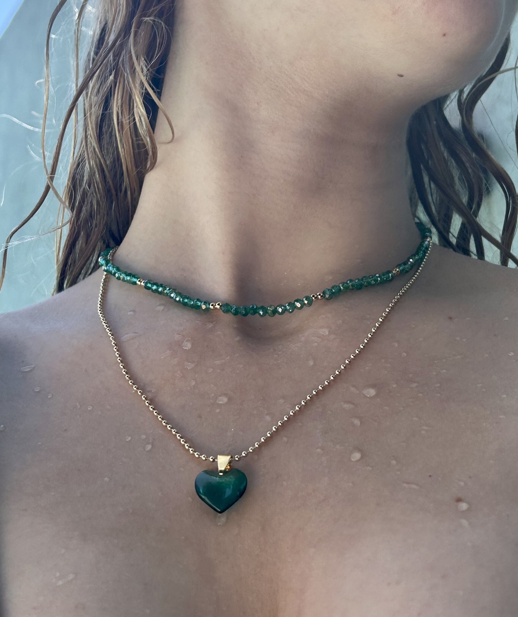 El collar Edén de Sabana Joyas es de Gold Filled baño de oro 18k, es hecho con tanza de acero, con separadores de balines para darle un toque de brillo y con cristales checos en colores negro, plata, bronce y verde esmeralda. Este collar mide 42cm, una medida comoda para usar.