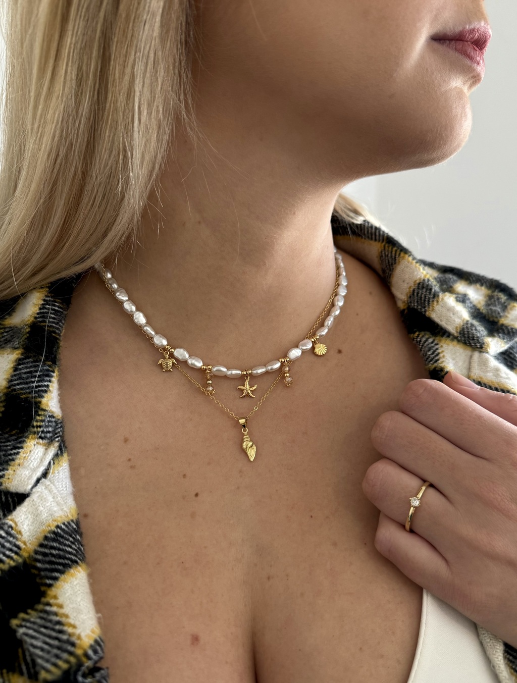 El collar Mar de Sabana Joyas es de Gold Filled baño de oro 18k importado, con dijes referente al mar como, una ostra de mar, estrella de mar, tortuga marina, los balines y cristales checos que representan la arena y las perlas que hacen refencia al agua. Mide 42cm, puedes alargarla con nuestra cadena de Extensión.