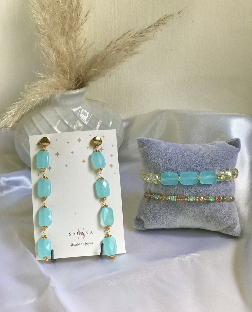 El dúo de pulseras Cielo de Sabana Joyas es de Gold Filled baño de oro 18k, trae dos pulseras de tanza elastica, con cristales checos en color nude, azul, cristal y tres hermosas piedras facetada azul clara.