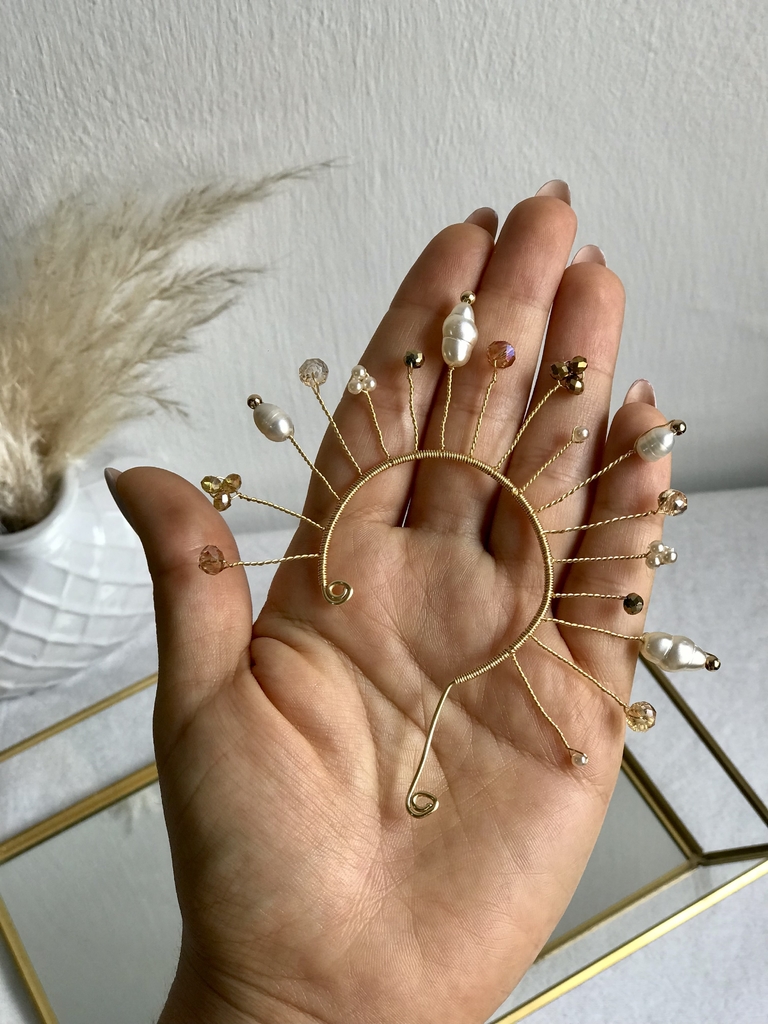 Los Ear Cuff Gloria de Sabana Joyas son hechos con alambre bañado en plata color oro, con diferentes detalles en perlas cultivadas, cristales checos en color dorado o negro, balines dorados, es ajustable para colocar comodo a la medida, va detrás de la oreja quedando elegante y llamativo.