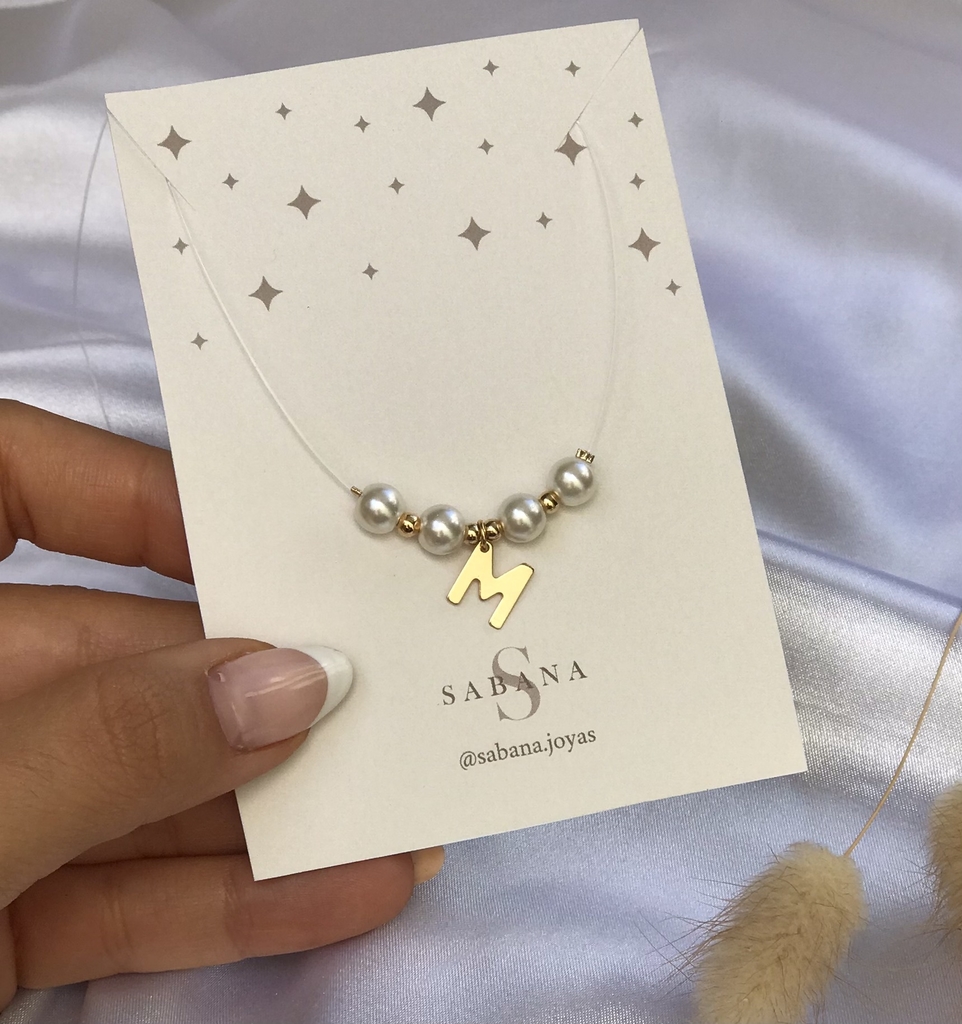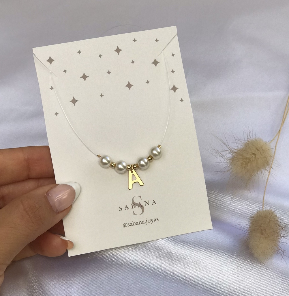 El fantasmita Inicial de Sabana Joyas esta hecho con tanza de acero, perlas de vidrio, balines y con un dije de inicial en Gold Filled baño de oro 18k. Tiene el efecto de un collar invisible, por eso lleva el nombre de Fantasmita.