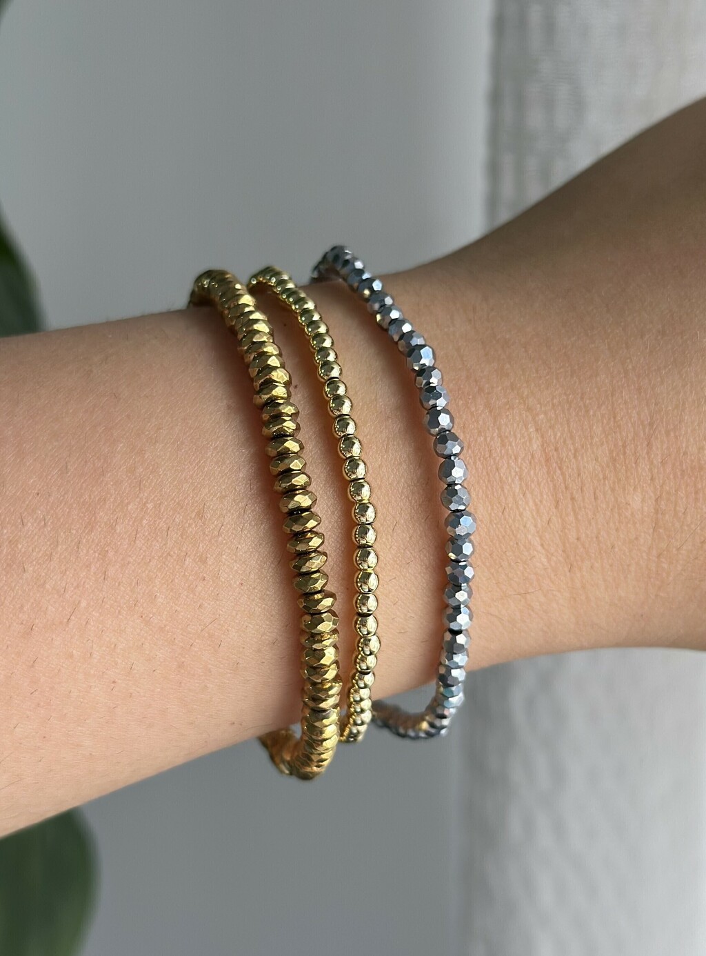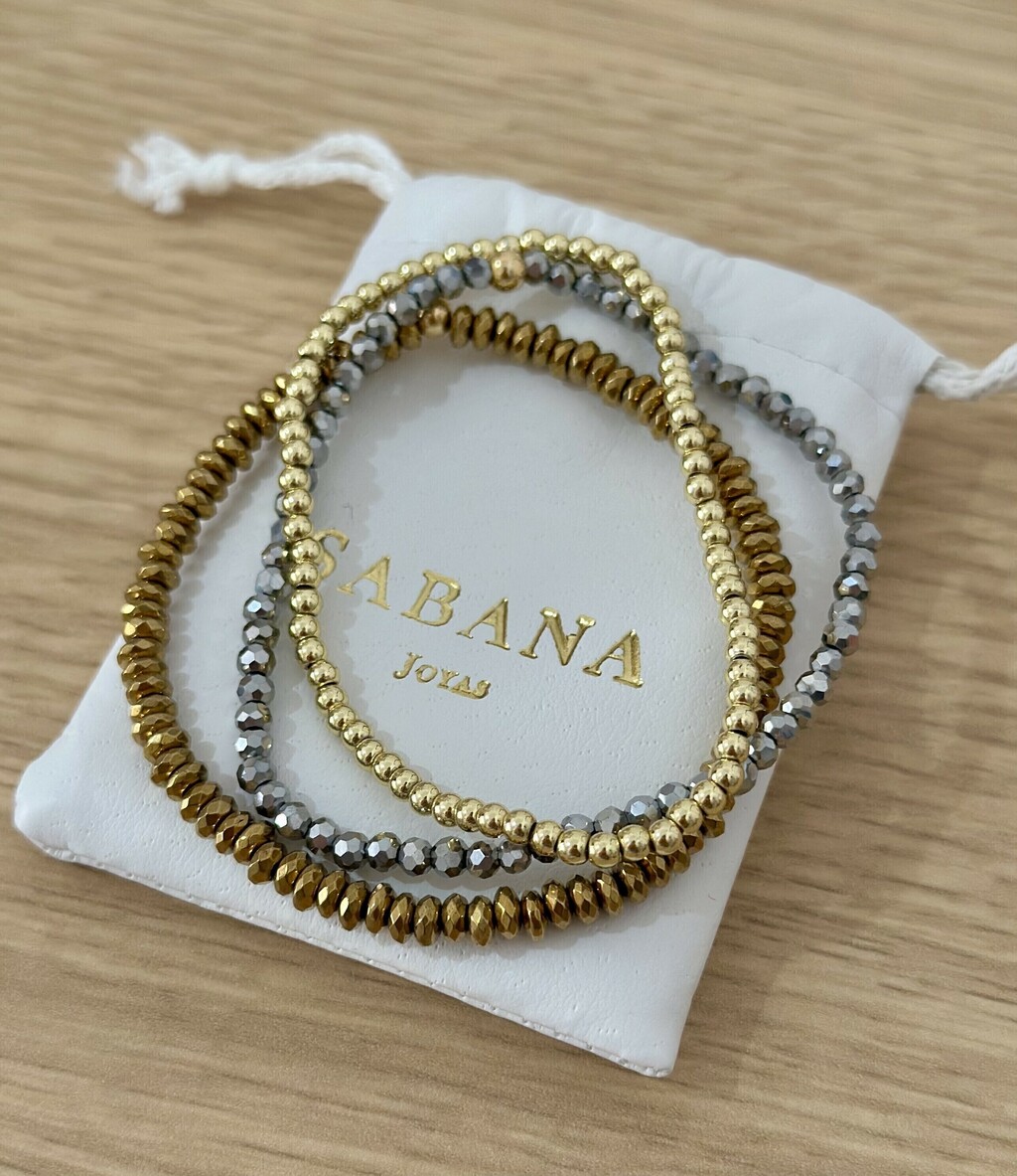 El mix de pulseras Tierra, Viento y Fuego de Sabana Joyas es de Gold Filled baño de oro 18k importado, trae tres pulseras de tanza elastica para que las puedas usar comodas a la medida de tu mano, en colores dorado, bronce y plata, con cristales checos, balines de Gold Filled y piedra hematite facetada.