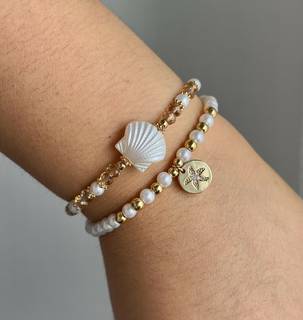 La pulsera Bahía de Sabana Joyas es de Gold Filled baño de oro 18k, importado, es ajustable, con cristales checos en color beige, con perlitas y un dije en el centro de una ostra. Ideal para la playa, pileta y todo el verano.